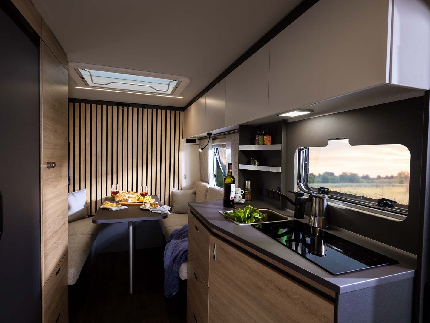 Кухнята в Yaseo 340 PX е компактна, но напълно функционална за кратки и средни пътувания. Тя предлага котлони, мивка и хладилник с обем около 90 литра, достатъчен за самостоятелно къмпингуване. Санитарният модул също следва минималистичната логика на модела – пространството е оптимизирано така, че да включва душ и тоалетна, без да натоварва интериора. Макар и компактна, банята е напълно използваема и отговаря на очакванията за комфорт в този клас.