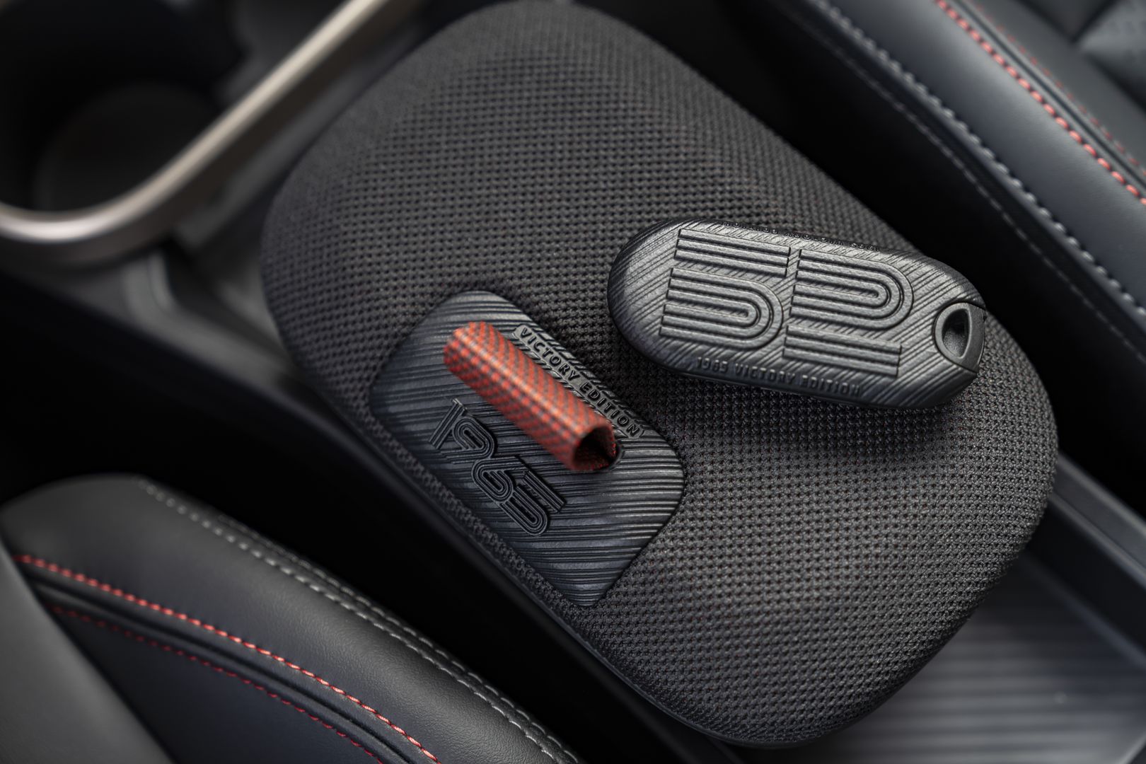 Влизайки вътре, веднага ви посрещат праговете с надпис „1965“. Интериорът е решен в духа на JCW – агресивно черно и червено, но с малки намигвания към историята. Номерът „52“ се появява дори върху капачката на ключа, а на волана и централната конзола е добавена годината на триумфа.